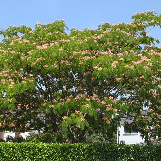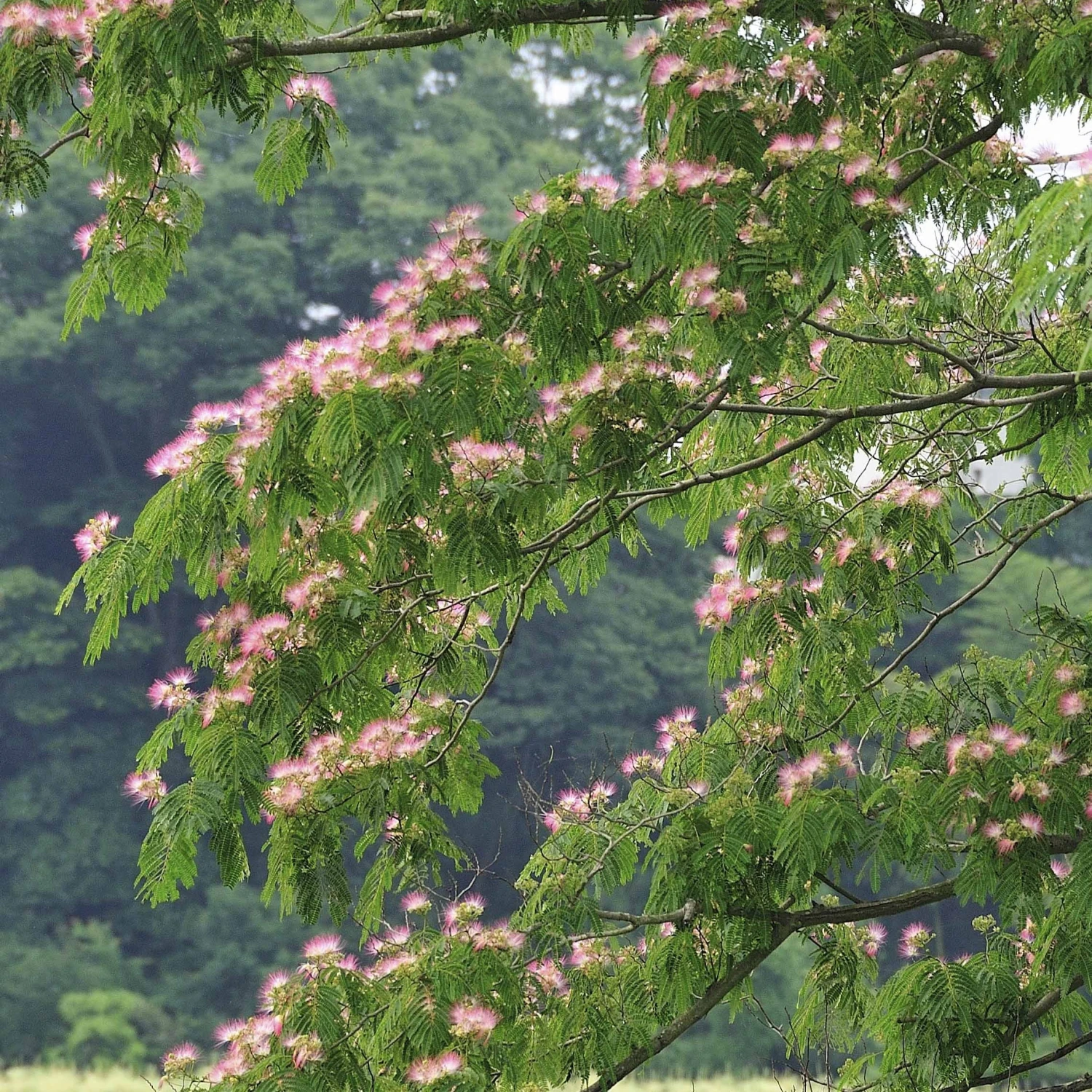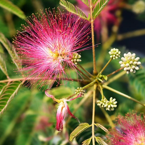 Cet arbre présente de nombreux atouts, dont une très belle floraison rose foncé en gros pompons soyeux mise en valeur par un fin feuillage persistant qui fournit par ailleurs une ombre légère très appréciée en été.