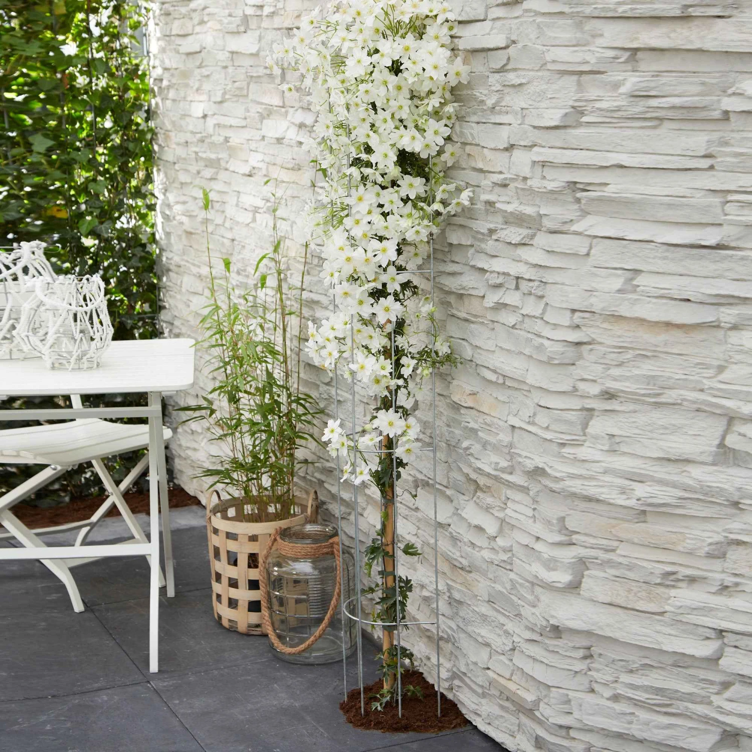 L’association de la Clématite Avalanche dépend essentiellement de l’effet dont vous attendez. Comme exemple, les équipes Willemse vous recommandent de la planter aux côtés du Dianthus deltoïdes (Œillet à Delta), pour obtenir une touche parfumée et colorante. Cette variété de couvre-sol élabore une fluorescence parfumée, aux tons rouges, roses et blancs. De même, pour garder au frais le pied de votre plante, l’Achillée Tomenteuse est idéale. Cette plante gazonneuse fournit une floraison jaune solaire. Par ailleurs, si vous voulez une touche plus contraste avec cette plante, nous vous conseillons de l’accompagner avec un fusain de la variété ‘Harlequin’. Elle arbore un feuillage crème et une floraison fuchsia, idéale pour cet effet.