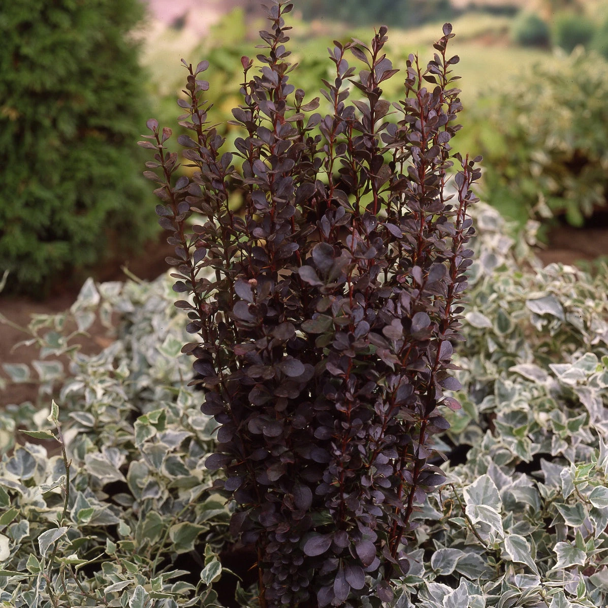 Le Berberis thunbergii ‘Helmond Pillar’, de la famille des BerbĂ©ridacĂ©es, parfois nommĂ© vinettier du Japon, a des branches Ă©pineuses et des feuilles pourpres caduques. Il grandit verticalement, comme une colonne de verdure. Il est originaire d’Asie et orne souvent les jardins au Japon. Il est dense et peut atteindre une hauteur de 2 m Ă maturitĂ©. Sa croissance est rapide. Les Ă©pines sont simples, mais se prĂ©sentent parfois sous forme de tridents situĂ©s près des nĹ“uds. Les feuilles, quant Ă elles, sont petites et ovales. Les fleurs de couleur jaune pâle striĂ©es de rouge donnent des fruits rouges juteux qui sont comestibles. En automne, l’épine-vinette de Thunberg Helmond Pillar est buissonnante et offre de magnifiques couleurs rouges, voire orangĂ©es. Ses racines contiennent de la berbĂ©rine qui a des propriĂ©tĂ©s antibactĂ©riennes.