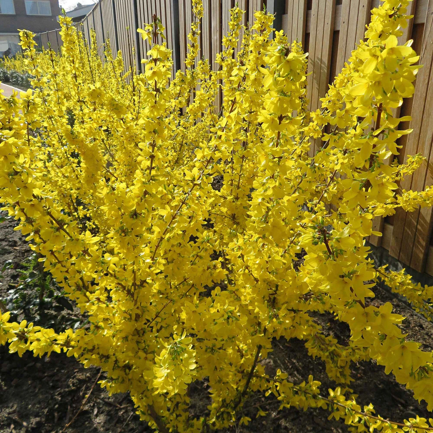 Pour planter le Forsythia ‘Mikador’ en haie, laissez aux pieds suffisamment de place en les espaçant de 60 cm à 1,50 m les uns des autres.