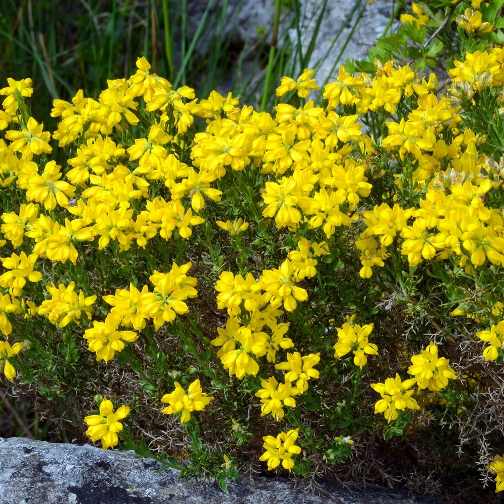 Originaire de l’Afrique du Nord et du sud de l’Europe, le Genista hispanica (genêt piquant d’Espagne) est un petit arbuste vivace que l’on retrouve majoritairement dans les climats méditerranéens du sud de la France. Membre de la famille des Leguminosae, il présente des petites feuilles alternes d’aspect simple, mais dont le dessous est particulièrement soyeux au toucher. L’arbuste est livré dans un pot de 2L, mesurant aux alentours de 25 cm de haut. Arrivé à maturité, il ne dépasse pas 75 cm de hauteur et 1,5 m de largeur ; il présente un port étalé assez bas. D’avril à septembre, il entre en période de floraison et se retrouve alors parsemé de petites fleurs jaunes, qui, malgré leur couleur vive, ne sont pas mellifères et ne dégagent aucun parfum. Puis, à l’arrivée de l’automne, l’arbuste perd ses feuilles, mais conserve des tiges souples particulièrement vertes, ce qui lui donne cet aspect de feuillage persistant.