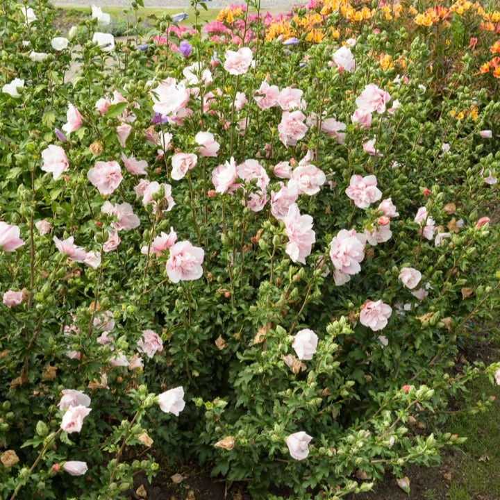 Hibiscus Syriacus Pink Chiffon (AlthĂ©a) fleurit avec des fleurs duveteuses. La floraison vigoureuse rendra votre jardin rempli Ă ras bord de fleurs roses en dentelle tout lâĂ©tĂ©. IdĂ©al en spĂ©cimen unique ou en haie fleurie