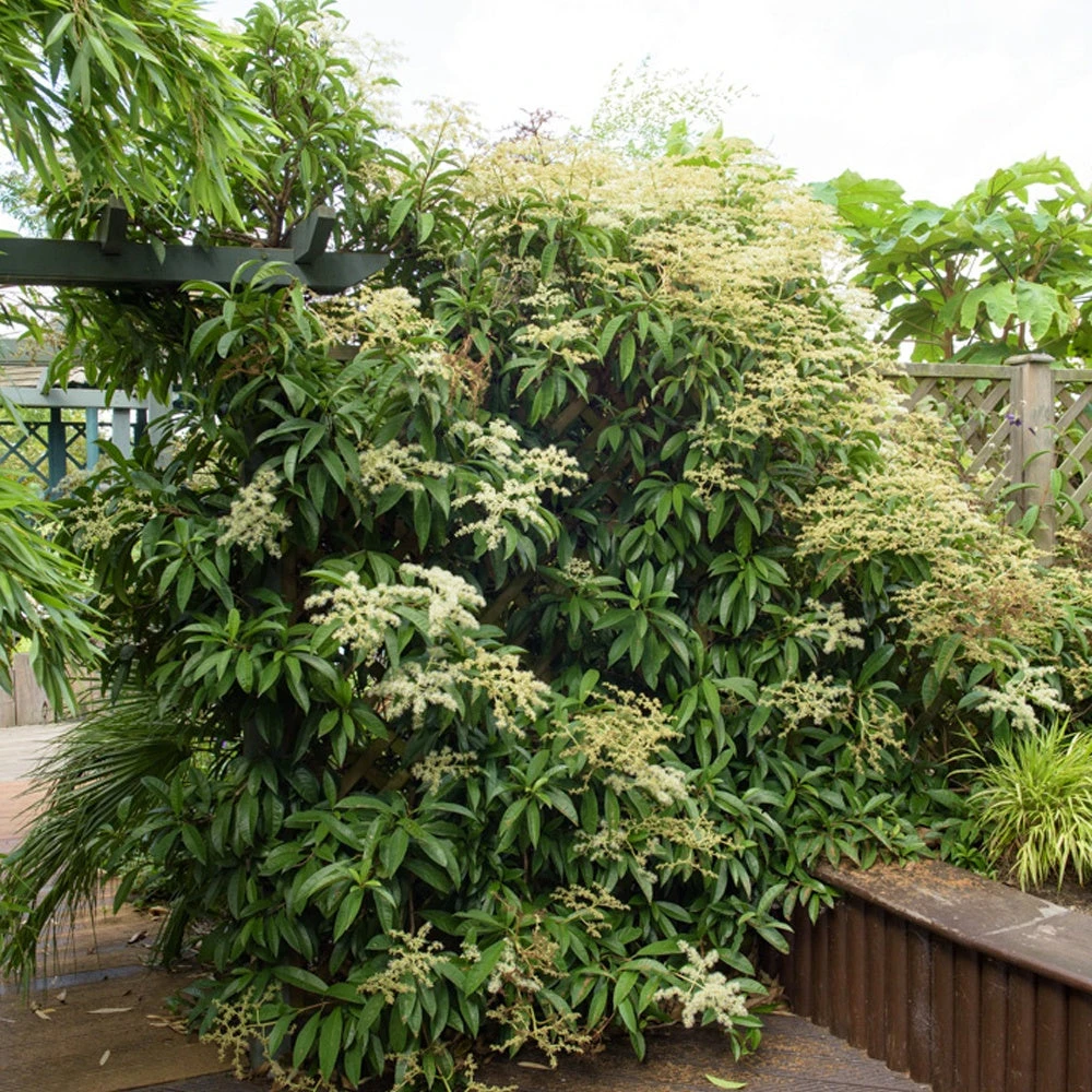 Aussi nommé fausse viorne, le Pileostegia viburnoides fait partie de la famille des hortensias (Hydrangéacées). Originaire d’Asie (Taïwan, Chine, Inde), cette plante grimpante ligneuse est proche de l’hortensia grimpant. Encore rare en culture, elle produit de longues tiges munies de racines adventives qui s’accrochent sur tout type de support. Ses longues feuilles persistantes sont vert sombre, coriaces, oblongues et rappellent celles du laurier-cerise (Prunus lauricerasus). En fin d’été, entre août et octobre, le Pileostegia viburnoides dévoile de grandes panicules aériennes de couleur blanc crème, très mellifères, non parfumées, à étamines proéminentes et dépourvues de pseudofleurs.
